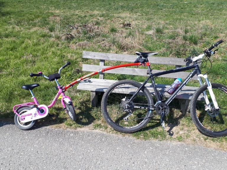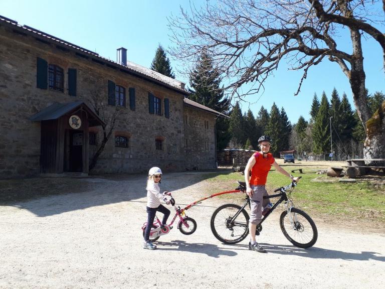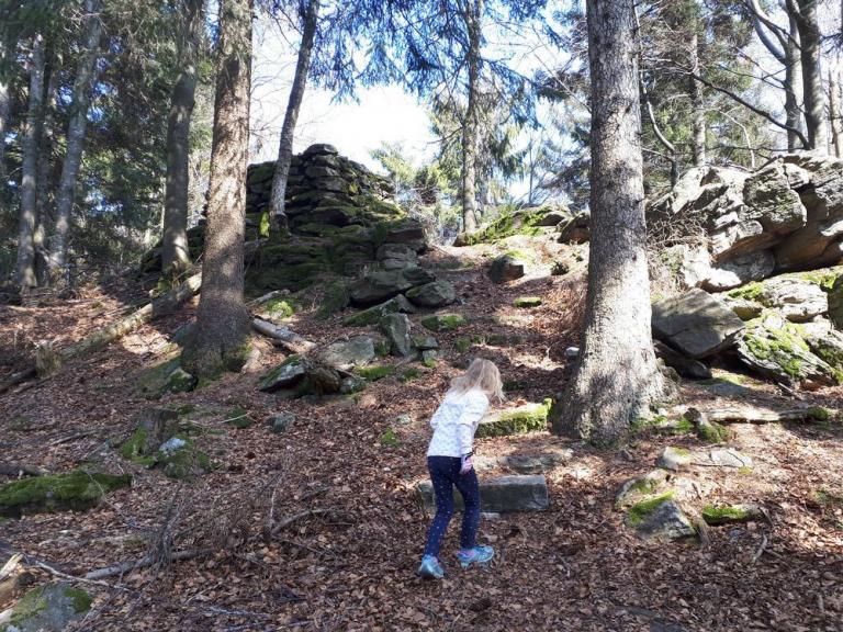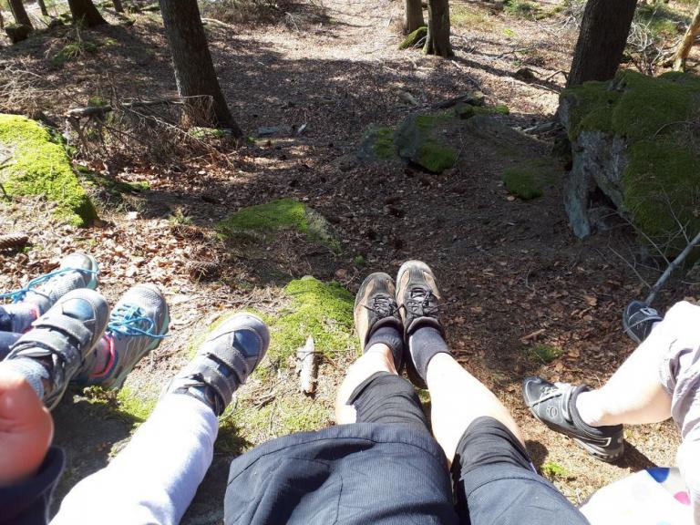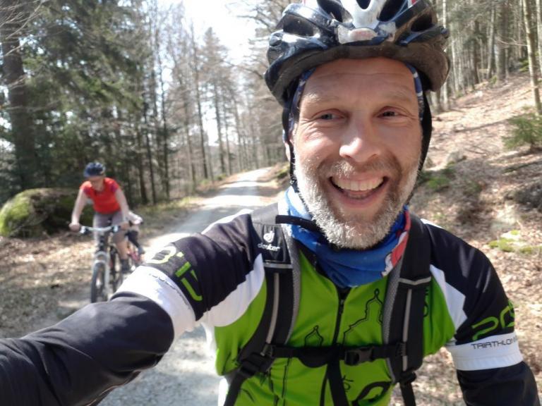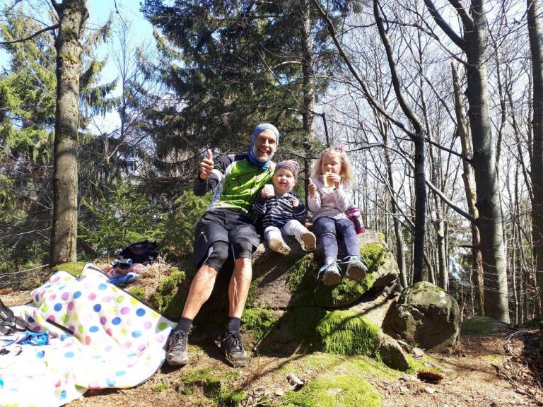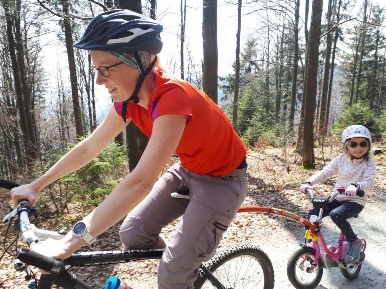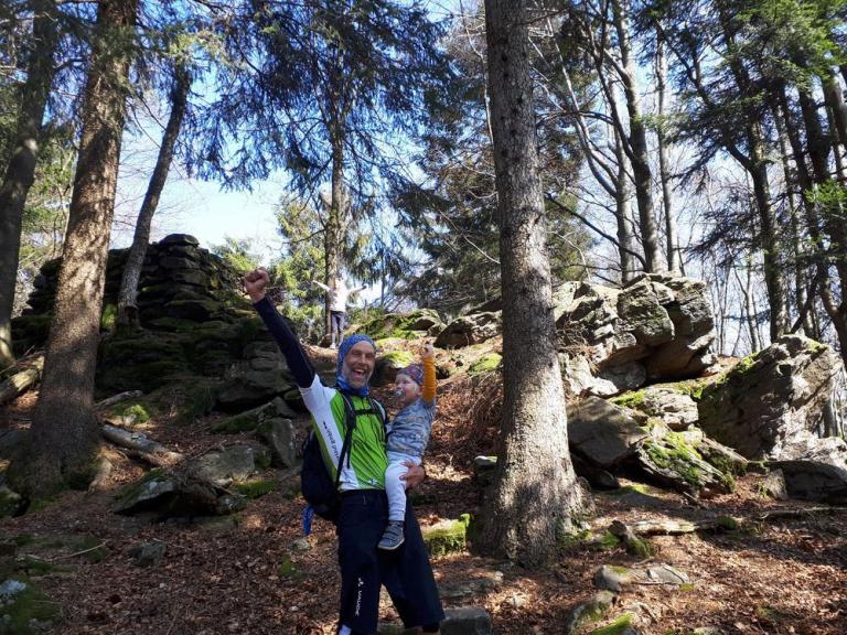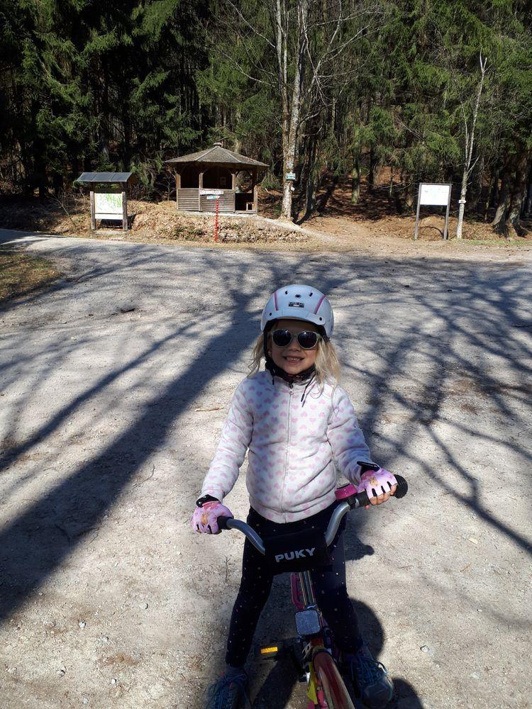 Das traumhafte Wetter wollten wir natürlich wieder ausnutzen, dieses Mal mit einer MTB Tour. Emma fuhr an der Stange zusammen mit mir die 500 Höhenmeter bis zum Grandsberg. Brigitte kam mit dem Auto und Timi zum Wanderparkplatz hoch. Ich übernahm dann Timi im Babyjogger und Brigitte meine kleine Mountainbikerin an der Stange. Weiter ging es dann bis nach Ödwies und von dort in Richtung Platzl. 300 m nach Öswies bogen wir rechts in einen kleinen Pfad ein. Hier ließen wir die Räder stehen und gingen zu Fuß weiter. Nach ca. 10 Minuten standen wir dann am Gipfel des 1053 m hohen Kälberbuckels. Ein einladender und einsamer Gipfel. Wir machten Brotzeit und kraxelten auf den Felsen. Zurück fuhr dieses Mal Brigitte mit Timi im Jogger auf der Forststraße und Emma und ich fuhren einen matschigen Trail bis zum Schuhfleck. Hier trafen wir uns wieder und fuhren gemeinsam über den Mühlgrabenweg zurück zum Grandsberg und die Straße nach Hause. Insgesamt waren wir 3 Stunden, 27 km und 900 Hm unterwegs. Später lief ich nochmals zum Grandsberg hoch, um mein Auto zu holen...
