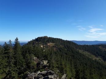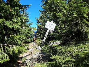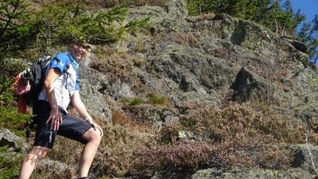 Mit etwas schweren "Haxn" vom gestrigen Ultralauf fuhren wir zum Osserparkplatz in Lohberg, wo wir uns mit Freunden und Arbeitskollegen trafen. Wir wanderten alle zusammen auf dem Wanderweg L01/L02 in Richtung Großer Osser. Nach ca.    Stunde gingen unsere Wege bei einem Forstweg auseinander. Daniel, seine Familie und ich mit den Zwergen wanderten den Normalweg weiter und Brigitte mit dem Rest der kleinen Gruppe bestieg den Osser über den felsigen Südgrat: Ein Teilstück dieser Wanderung führt über den felsigen Osser Südgrat, dieser Pfad ist nicht beschildert, er ist tlw. mit Steinmanderln und blauen Markierungspunkten auf den Felsen gekennzeichnet. Das Gelände ist hier tlw. steil, mit leichten, ungesicherten Kletterstellen (Klettergrad A) in schönem, griffigem Fels   Schwindelfreiheit und Trittsicherheit sind erforderlich. Das felsige, baumfreie Gelände wird immer steiler, man muss nun richtig "kraxeln", zwischendurch hat man wunderschöne, freie Aussichten auf Arber und Lamer Winkel. Bald kann man das Gipfelkreuz des Kleinen Osser, hoch oben auf dem Gipfelfelsen erkennen, bevor man dieses erreicht muss man sich jedoch noch über mehrere steile Felsstufen hochschwingen