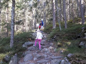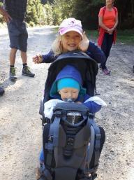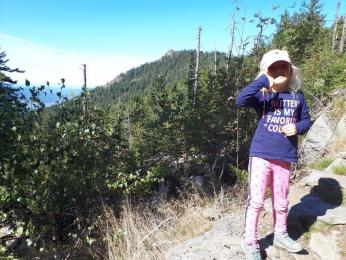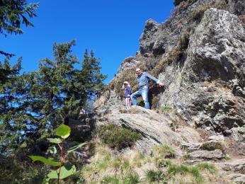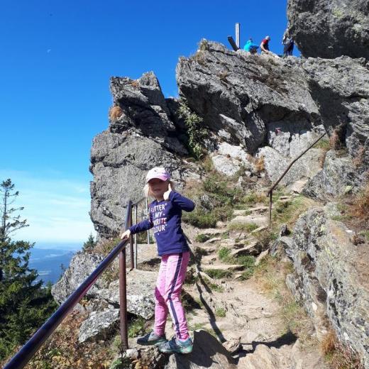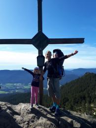 Die Wandergruppe mit den Kindern musste einen steilen Pfad weiter nach oben kämpfen. Timi saß bequem in der Kraxe und machte teilweise ein Nickerchen. Emma drehte jeden Stein um und war auf der Suche nach Käfern, Würmer und Spinnen :-) Der Aufstieg war kurzweilig und immer wieder hatten wir einen herrlichen Blick auf den Südgrat des kleinen Ossers, sahen aber unsere Klettergruppe nicht. Unser Weg wurde zum Schluss immer steiler und für die kleine Emma war klettern angesagt. Die kleine Maus war begeistert von den Kraxlstellen und wäre gerne noch mehr geklettert :-) Nach knapp zwei Stunden Aufstieg standen wir dann auf dem großen Ossergipfel mit seinen 1293 m. Die Aussicht zum Arber auf der einen Seite und den Tschechischen Bergen auf der anderen Seite war grandios. Die Osserschutzhütte war dank dem schönen Wetter restlos überfüllt, trotzdem rückten alle zusammen und wir bekamen einen Platz. Schon bald erreichte auch die Klettergruppe den Ossergipfel. Timi und Emma waren froh, ihre Mama zu sehen, die sich über den Südgrat auf den kleinen Osser gekämpft hatte. Jedem schmeckte das verdiente Siegerweißbier und den Kindern die Siegerschorle :-) Nach einer ausgiebigen Rast stiegen wir zusammen auf dem Normalweg ab. Ich war natürlich sehr stolz auf Emma, die knapp über 500 Höhenmeter im Aufstieg und auch den Rückweg alleine geschafft hatte. Am frühen Nachmittag erreichten wir wieder unseren Ausgangspunkt, den Osserwanderparkplatz in Lohberg