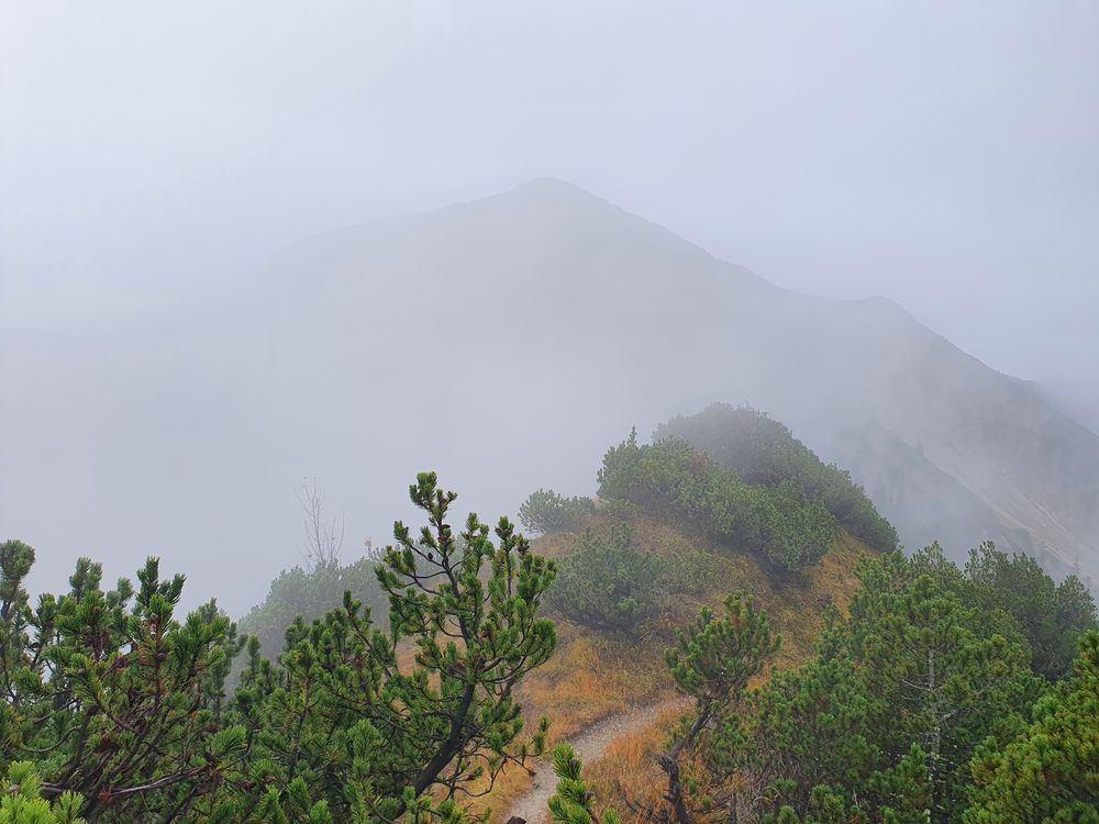 Erst als es Richtung eines Kammes deutlich steiler wurde, verlangsamten wir unser Tempo und gingen im flotten Schritt dem Gipfel der Halserspitze entgegen. Über leichte Kletterstellen und leicht zu begehende Schrofen überwanden wir die letzten Meter hinauf zum Bergkamm. Oben auf dem Blaubergkamm angekommen, mussten wir einfach stoppen. Nachdem wir während des Aufstiegs meistens im Nebel waren und nur Bruchteile der sonst gewaltigen Aussicht genießen konnten, breitete sich jetzt ein gewaltiges Panorama vor uns aus. Auf dem Kamm, über der Nebel- Wolkendecke, konnten wir die Karwendelkette, den Rofan und die anderen Achenseeberge über der, wie Wattebauschen aussehenden Wolkendecke sehen. Der vor uns aufragende Guffert war komplett von der Wolkendecke umschlossen. Nur die Spitze schaute aus dem Wolkenmeer. Was für eine Aussicht.